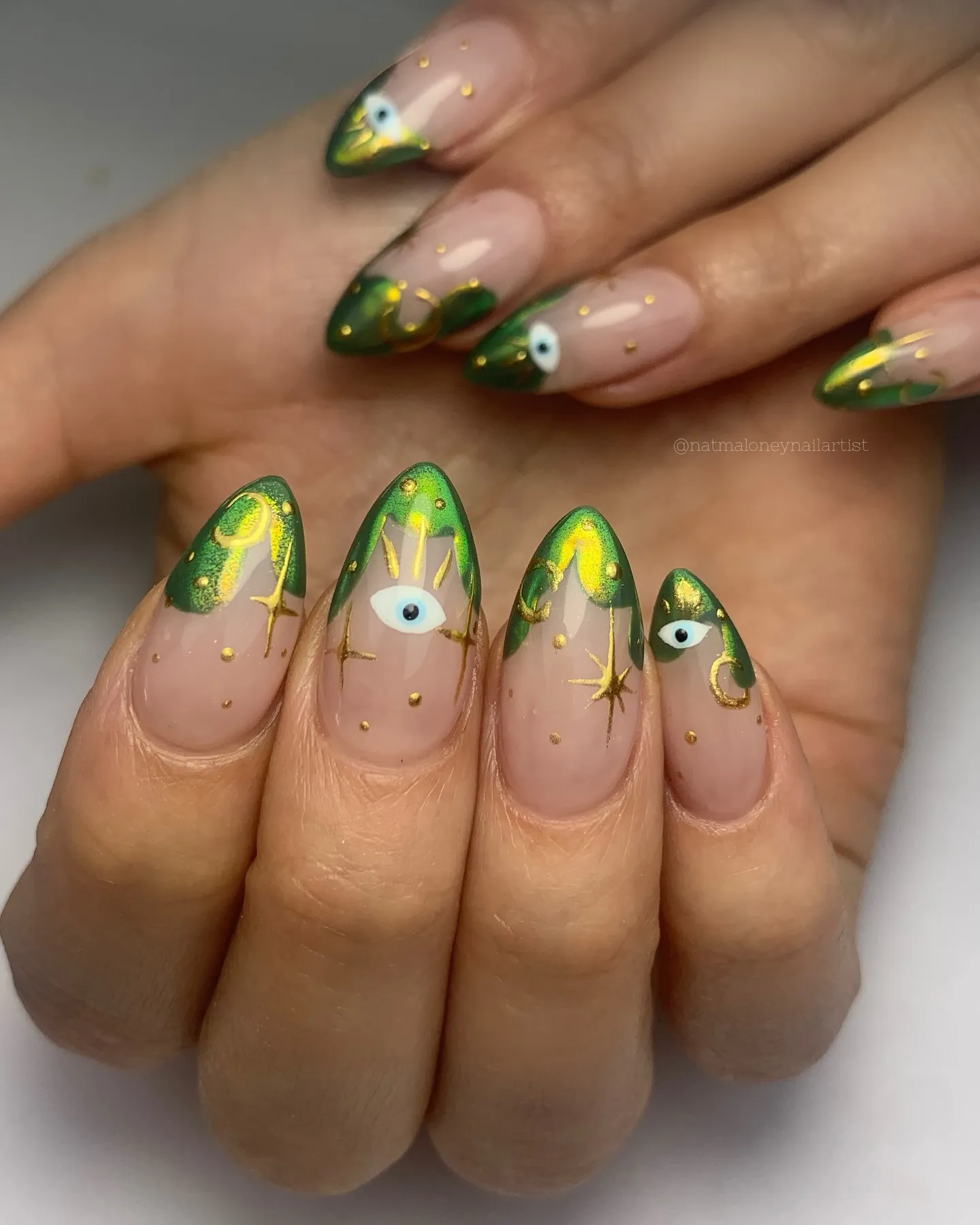 Try a backward French pattern with green tips for an unusual take on the classic French tip. Rather of painting the ends, the base of the nail is painted with green, leaving the tip bare or with tiny details.